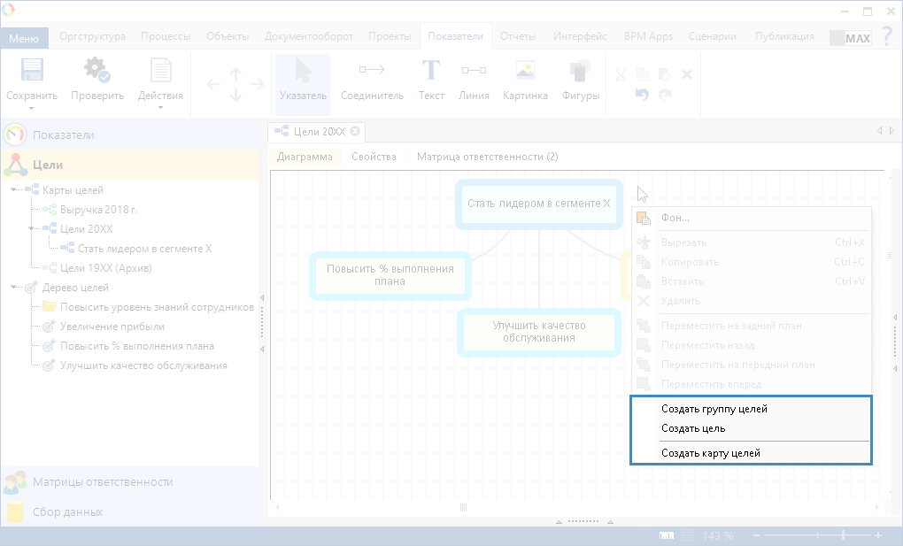 При нажатии правой кнопкой мыши на пустом месте рабочей области будет открыто контекстное меню (рис. 4) с основными кнопками-действиями (Создать группу целей, Создать цель и Создать карту целей).