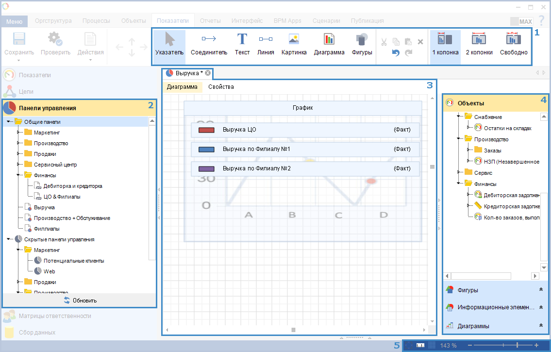 Рис. 2. Дизайнер ELMA. Вкладка "Показатели". Раздел "Панели управления"