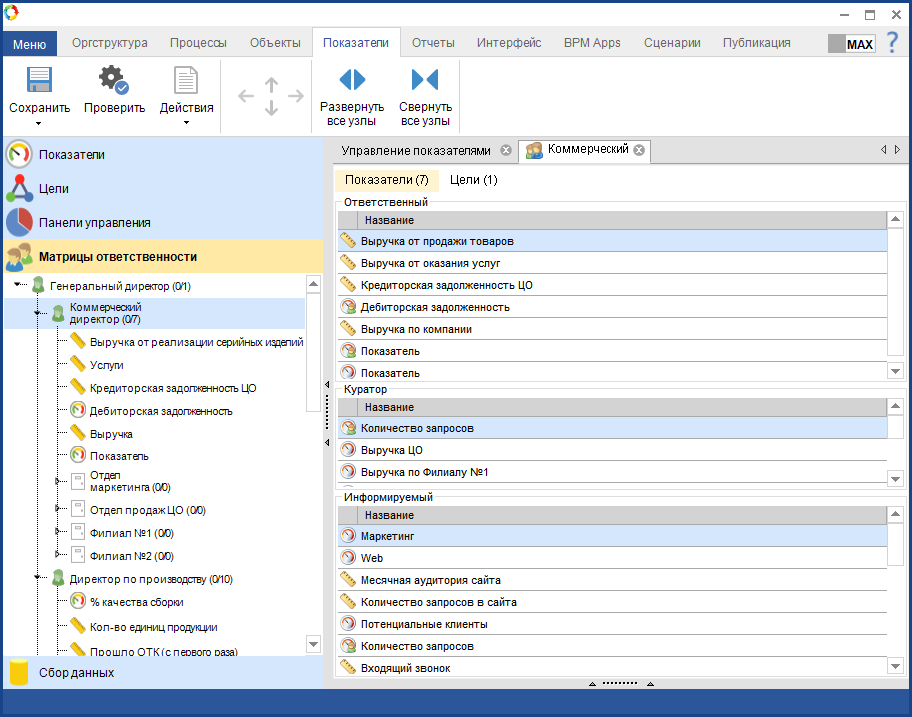 Рис. 2. Дизайнер ELMA. Вкладка "Показатели". Раздел "Матрицы ответственности"