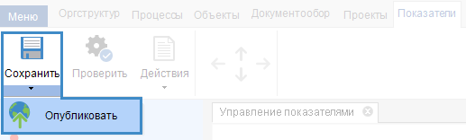 В случае, если в модели показателей есть неопубликованные изменения, то будет отображена надпись красного цвета Модель показателей изменена, а также будет доступна кнопка Опуликовать, при нажатии на которую будет осуществлена публикация модели показателей.