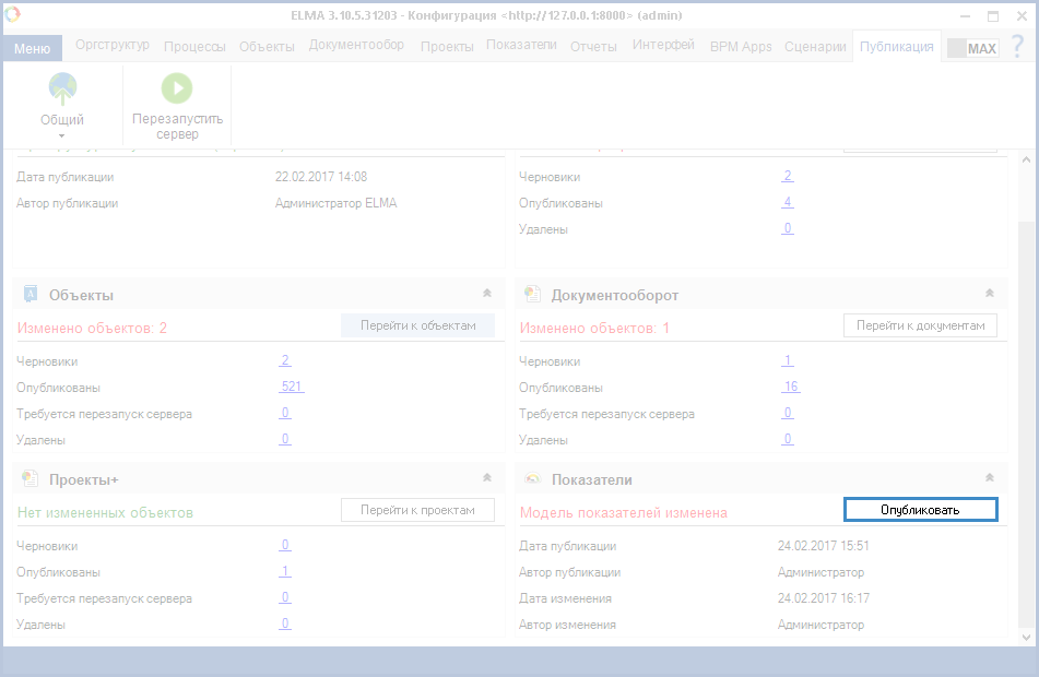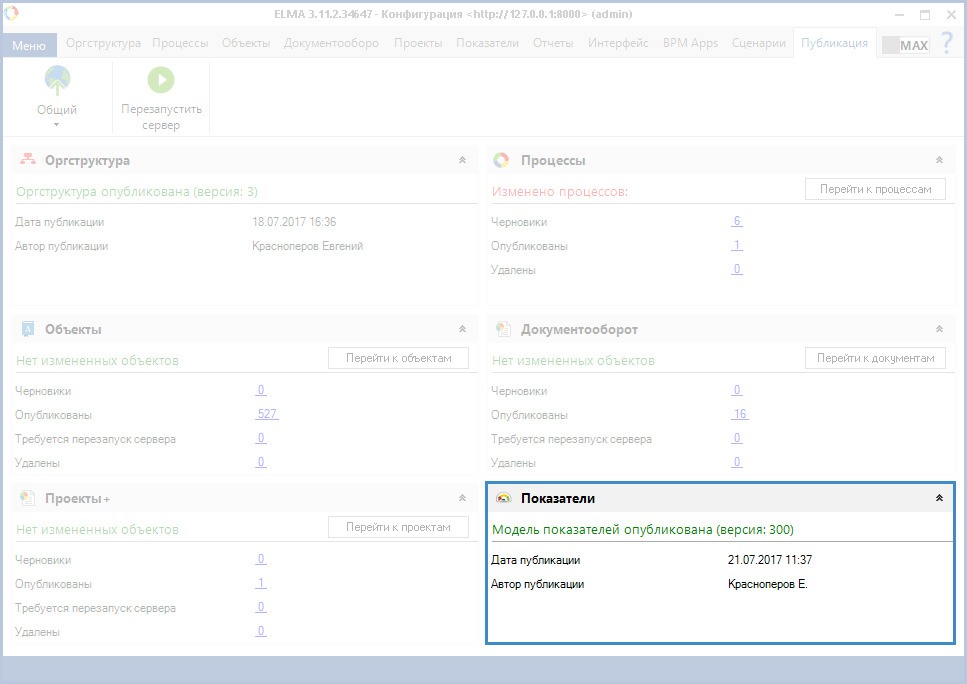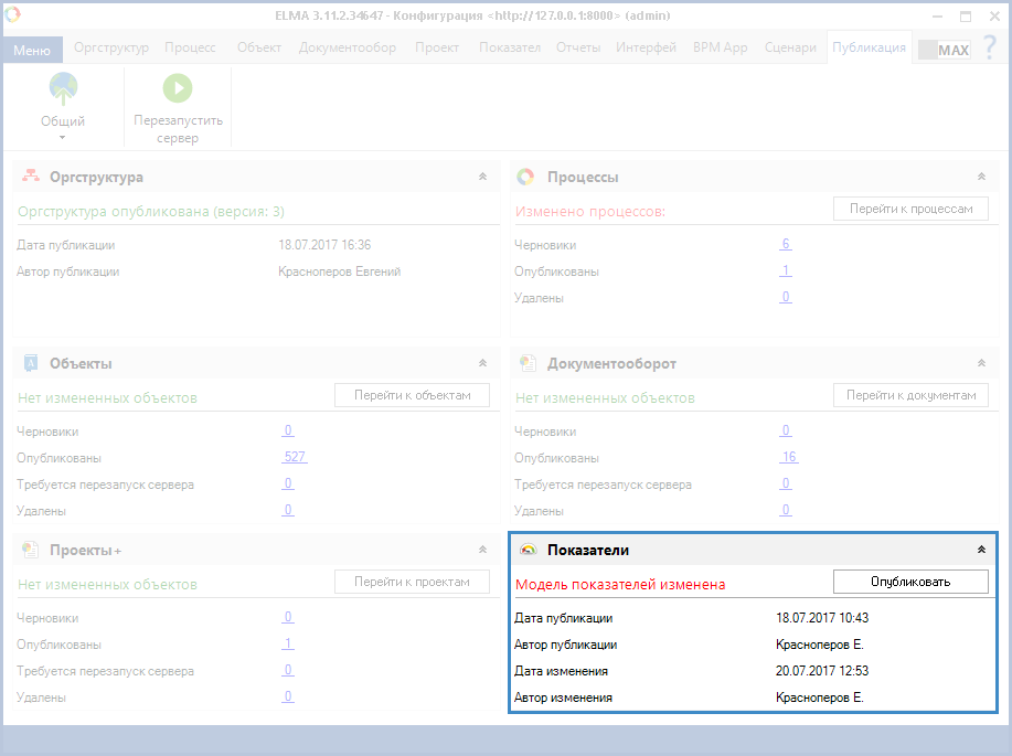 На вкладке ПубликацияДизайнера ELMA находится портлет Показатели (рис. 5), в котором отображена информация о публикации модели показателей, а также о последних изменениях в модели показателей.