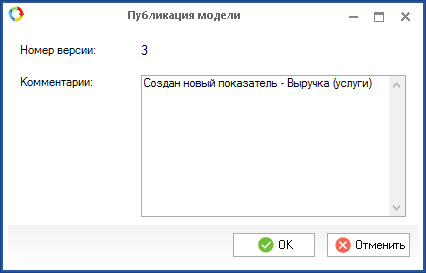 В диалоговом окне, появляющемся после нажатия кнопки Опубликовать, содержится порядковый номер публикуемой версии модели показателей (рис. 3). В поле Комментарии можно указать информацию о новой версии (например, о внесенных в модель изменениях). Содержимое этого поля отображается в разделе История версий в поле Комментарии (рис. 4).