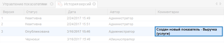 Рис. 4. История версий модели показателей. Поле "Комментарии"