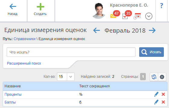 Каждый элемент справочника может быть отредактирован с помощью кнопки и удален с помощью кнопки . При нажатии на название единицы измерения оценок открывается ее карточка, которая аналогична странице создания единицы измерения оценки.