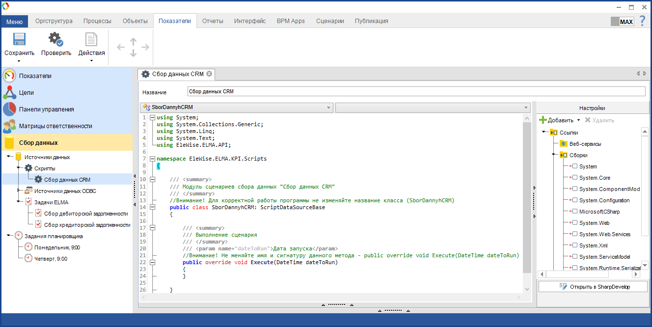 Скрипт – сценарий на языке C#, применяющийся для автоматического сбора данных значений показателей.