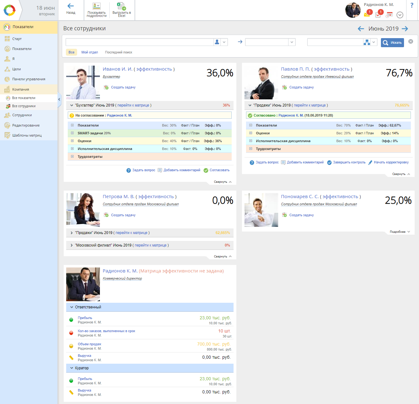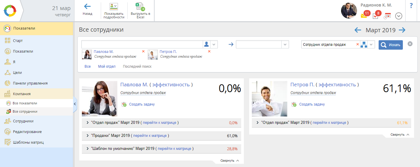 Следует отметить, что матрицы эффективности сотрудников, выведенных на экран в результате поиска, могут быть выгружены в файл Excel. Подробнее о данной возможности см.