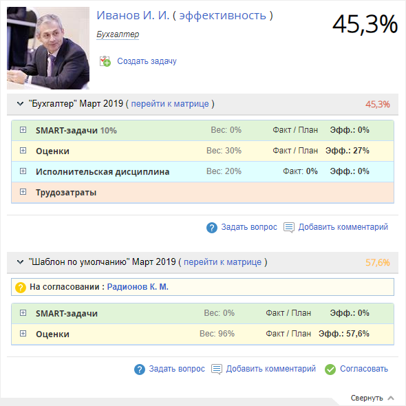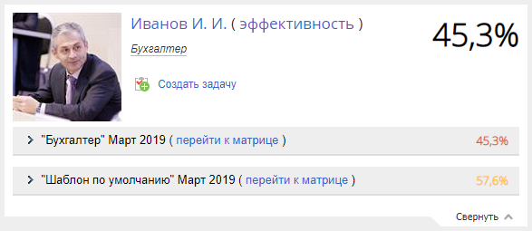 страницу матрицы эффективности пользователя, а также коэффициент эффективности сотрудника, вычисляемый по данной матрице. Для того, чтобы развернуть матрицу эффективности, необходимо нажать на пиктограмму
