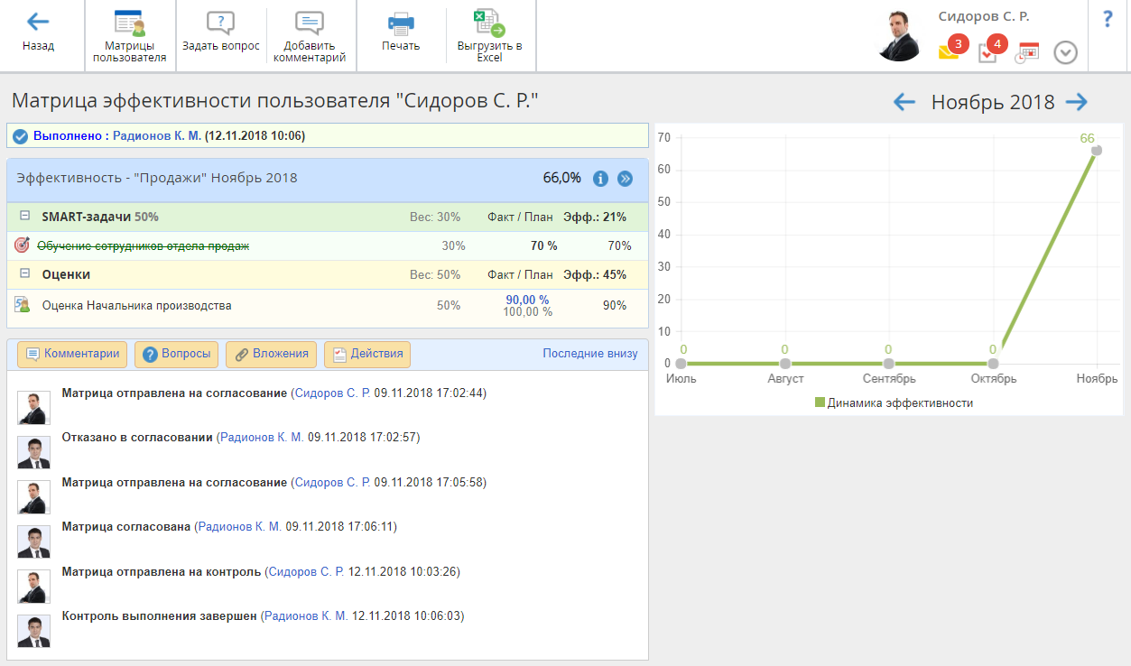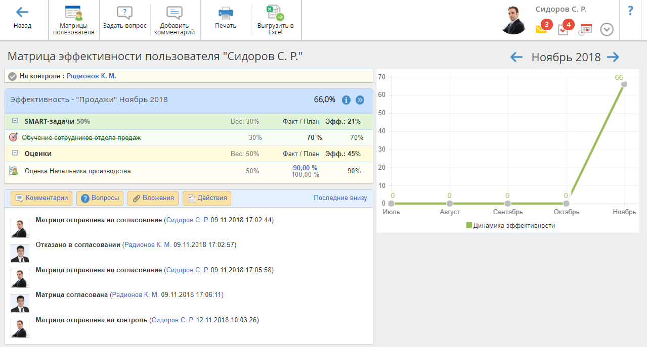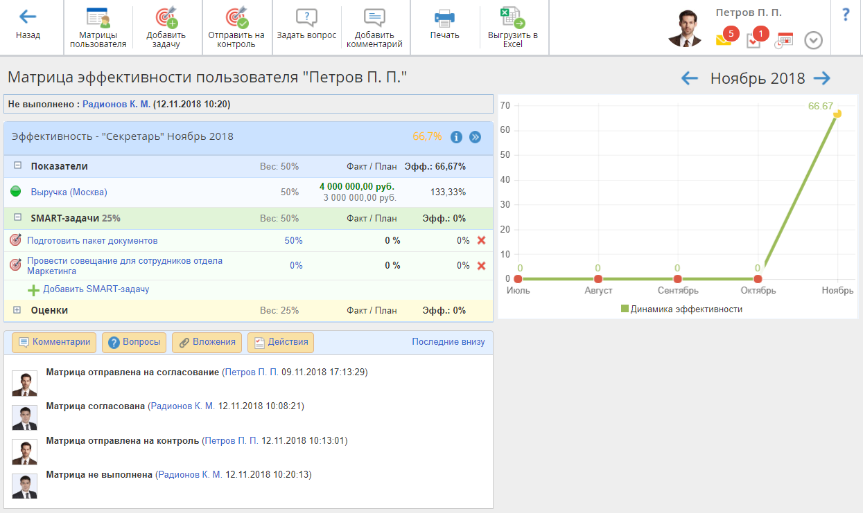 После заполнения данных в матрице эффективности она может быть отправлена на контроль для того, чтобы контролирующий мог проверить выполнение SMART-задач и ознакомиться информацией о достижении плановых значений показателей.