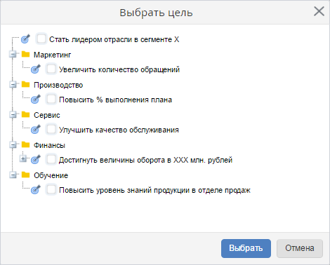 При нажатии на кнопку открывается диалоговое окно (рис. 9) с деревом существующих целей. Для того, чтобы прикрепить необходимые цели к SMART-задаче, требуется установить флажки слева от требуемых целей и нажать на кнопку Выбрать.
