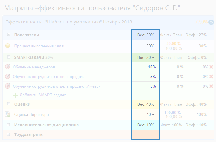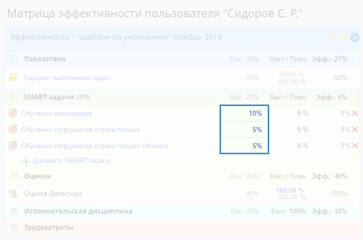 По умолчанию общий вес всех SMART-задач вычисляется как разница между суммой показателей, оценок и исполнительской дисциплины к 100% (общий вес эффективности).