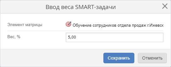 Вес SMART-задачи – это ее значимость (важность выполнения) среди всех SMART-задач в определенной матрице эффективности. Вес оценивается в процентах.