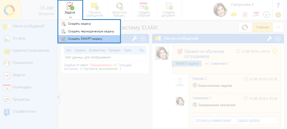 Рис. 2. Главная страница системы ELMA. Кнопка "Задача – Создать SMART-задачу"