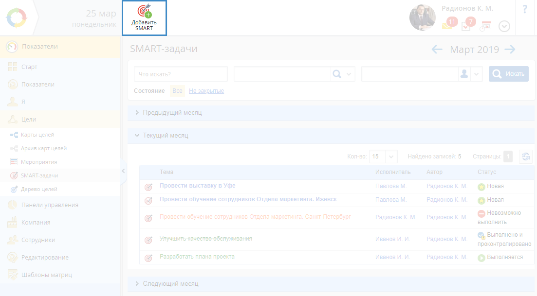 Рис. 3. Раздел "Управление по целям – SMART-задачи". Кнопка "Добавить SMART"