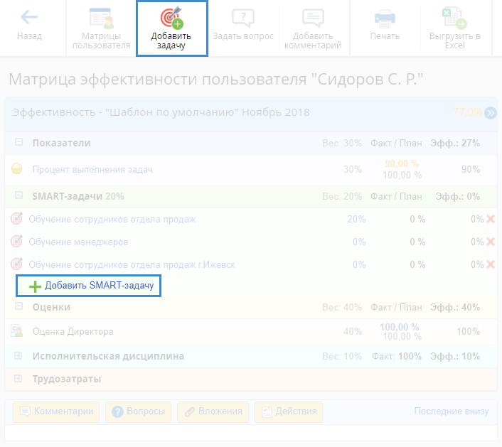 Рис. 4. Матрица эффективности. Кнопки "Добавить задачу" и "Добавить SMART-задачу"