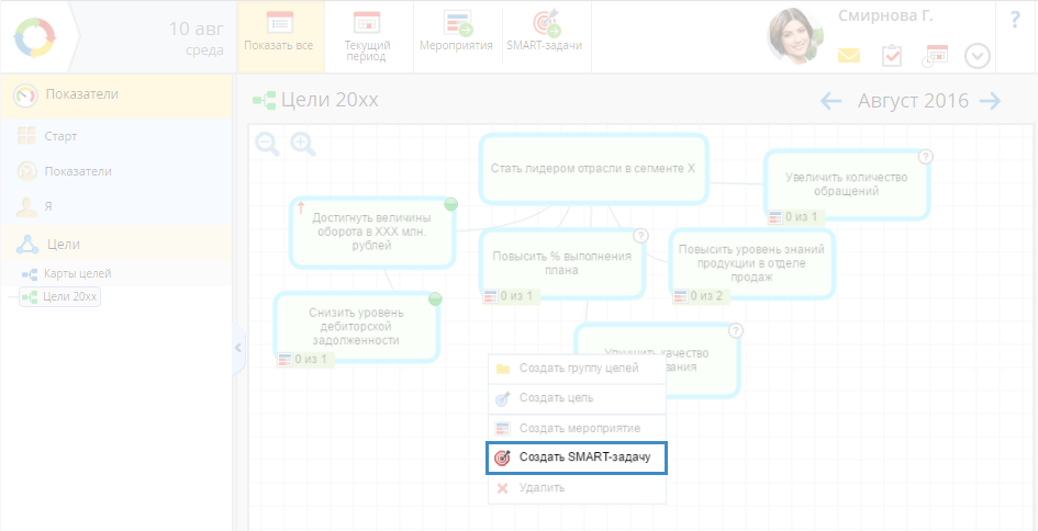 Рис. 6. Карта целей. Контекстное меню цели. Пункт "Создать SMART-задачу"