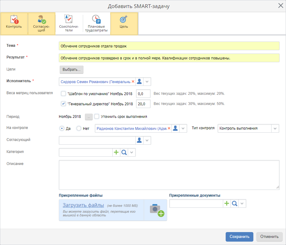 В данном случае в поле Исполнитель автоматически подставится имя текущего пользователя, а поле Вес будет соответствовать весу создаваемой SMART-задачи в данной матрице эффективности.
