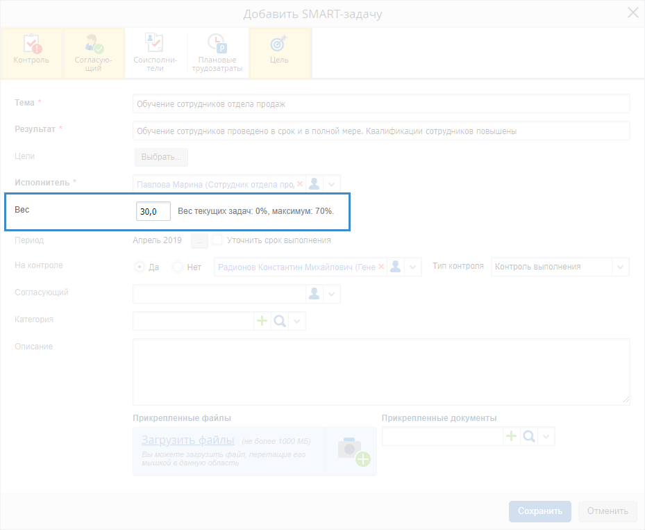Рис. 8. Диалоговое окно "Добавить SMART-задачу". Поле "Вес"