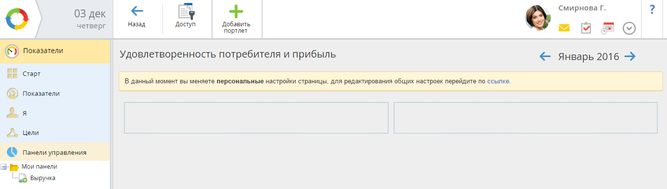Изначально, портлетная страница пустая. Портлеты добавляются на данную страницу из раздела Контрольные панели KPI.