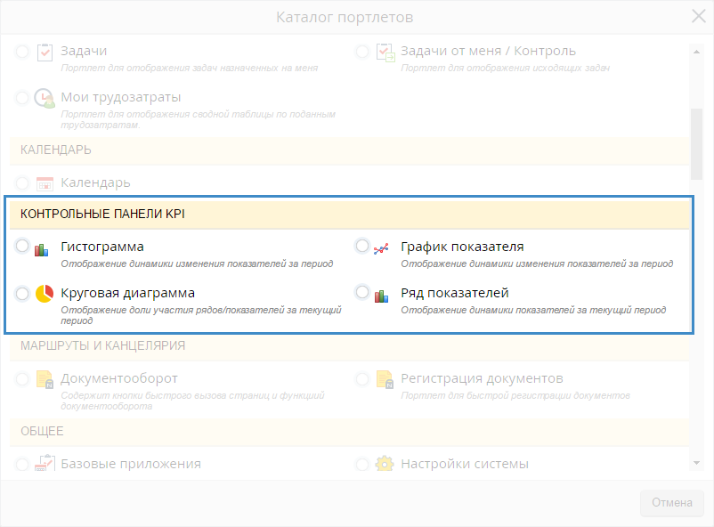 Рис. 6. Каталог портлетов. Раздел "Контрольные панели KPI"