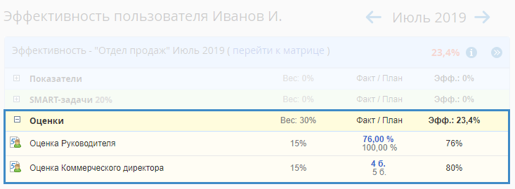 Эффективность работы сотрудников предприятия не всегда можно оценить только показателями или SMART-задачами, иногда бывает необходима оценка сотрудника вышестоящим руководством (согласно оргструктуре предприятия). Такая оценка выставляется 1 раз в месяц и напрямую влияет на эффективность сотрудника.