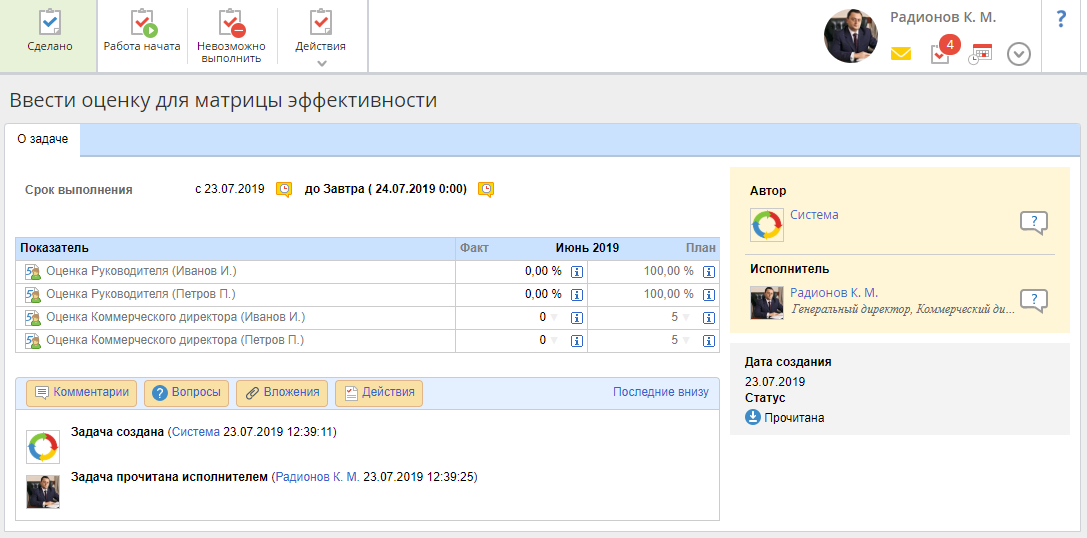 В первый рабочий день каждого месяца пользователям, ответственным за выставление оценок, ставятся задачи (рис. 3) оценки сотрудников за предыдущий период.