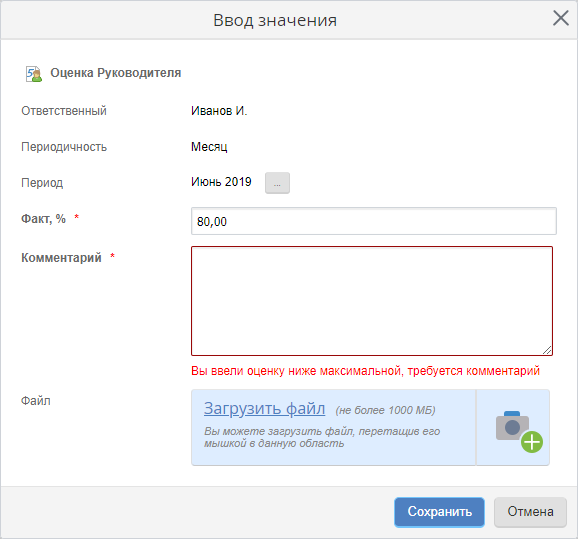 , расположенную внутри требуемой ячейки. Данная форма позволяет изменить период выставляемой оценки, выставить фактическую оценку, добавить комментарий и/или загрузить файл.