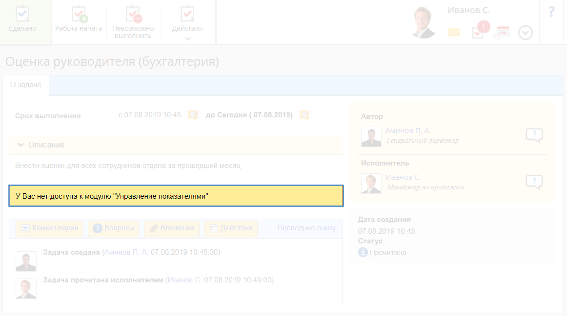 Рис. 6. Задача оценки сотрудника. Сообщение об отсутствии необходимых прав доступа