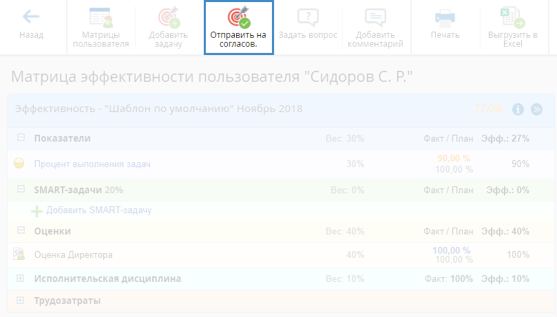 При нажатии на данную кнопку статус матрицы эффективности изменится на Согласовано. Исполнитель этой матрицы эффективности больше не может ее менять – добавлять и/или удалять SMART-задачи, менять их веса, вносить изменения в трудозатраты, оценки и показатели.