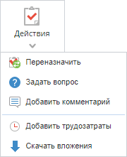 При нажатии на кнопку Действия и/или пиктограмму открывается выпадающее меню, которое предлагает: