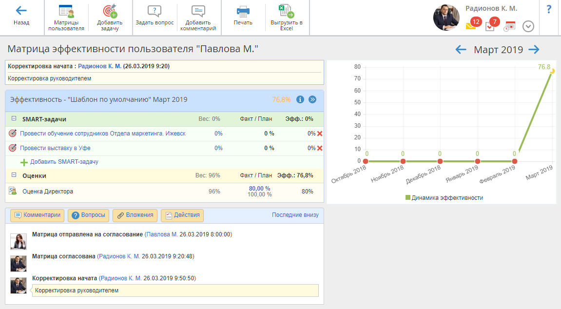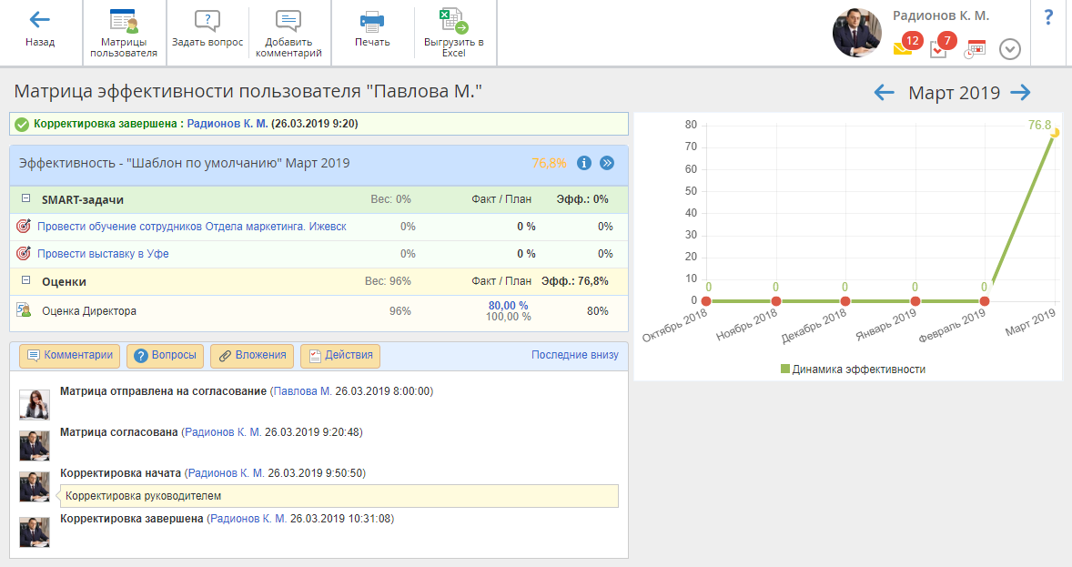 На странице матрицы эффективности будет отображено соответствующее уведомление (рис. 11) о завершении корректировки с указанием пользователя, совершившего корректировку матрицы эффективности.