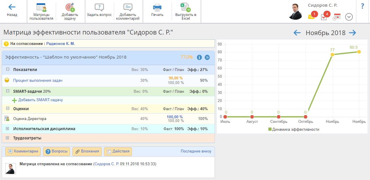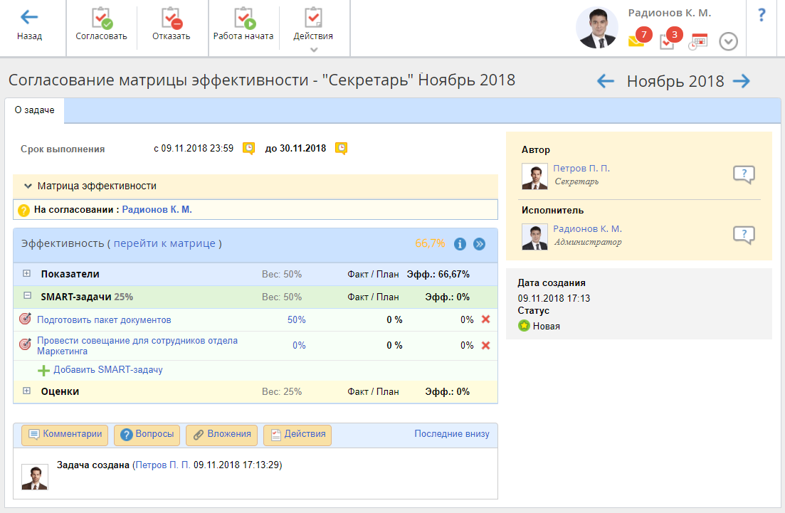 Назначение механизма согласования матрицы эффективности – запретить исполнителю добавлять и/или удалять SMART-задачи и менять их вес (с момента согласования матрицы и в течение периода ее исполнения). Следует отметить, что отправлять матрицу эффективности на согласование может только исполнитель данной матрицы.