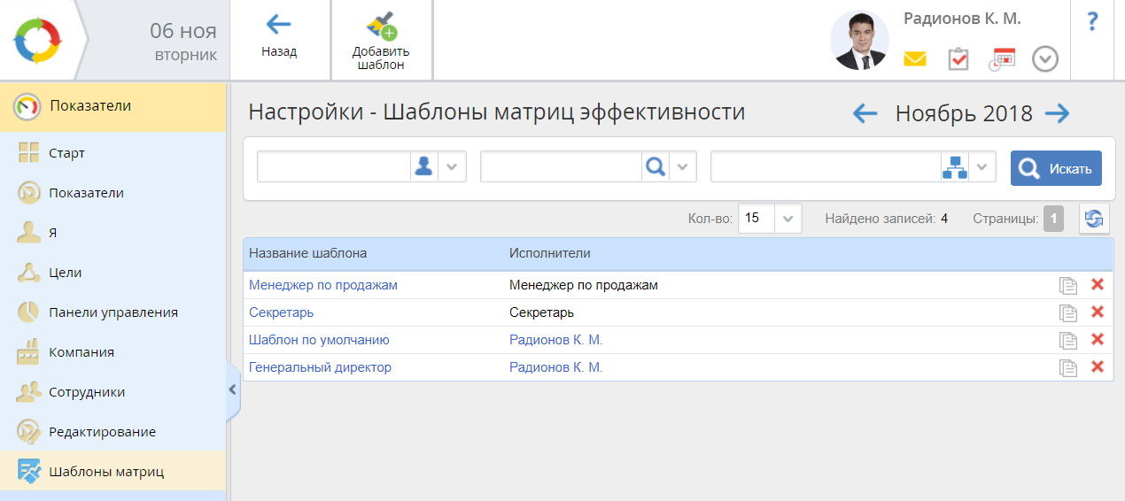 Данный раздел содержит форму поиска шаблонов матриц эффективности и список всех матриц системы.