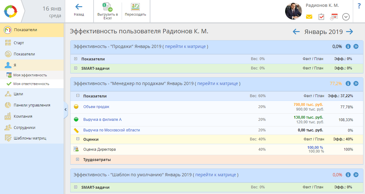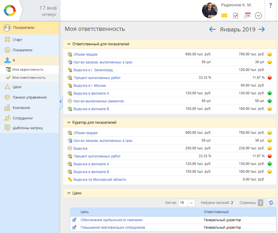 Я – раздел, позволяющий пользователю отслеживать собственные показатели эффективности (рис. 2), а также показатели, в которых данный пользователь указан ответственным или куратором (рис. 3).