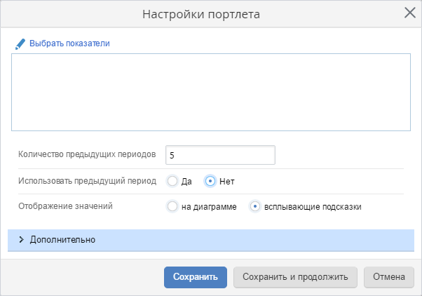 В случае, если требуется открыть карточку показателя, необходимо нажать левой кнопкой мыши по требуемому столбцу гистограммы. При необходимости установки дополнительных настроек необходимо нажать на блок Дополнительно (рис. 4) и заполнить все необходимые поля. Подробнее см. в соответствующем разделе справки.