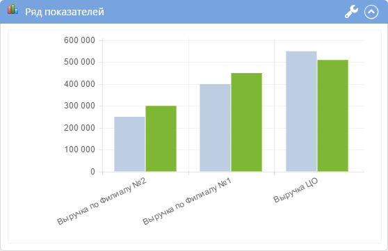 Портлет Ряд показателей (рис. 1) представлен в виде столбчатой диаграммы и отображает разницу между фактическим и плановым значениями каждого показателя за выбранный (текущий или предыдущий) период. В персональных настройках портлета осуществляется выбор показателей, настройка использования предыдущего периода и настройка отображения данных на диаграмме.