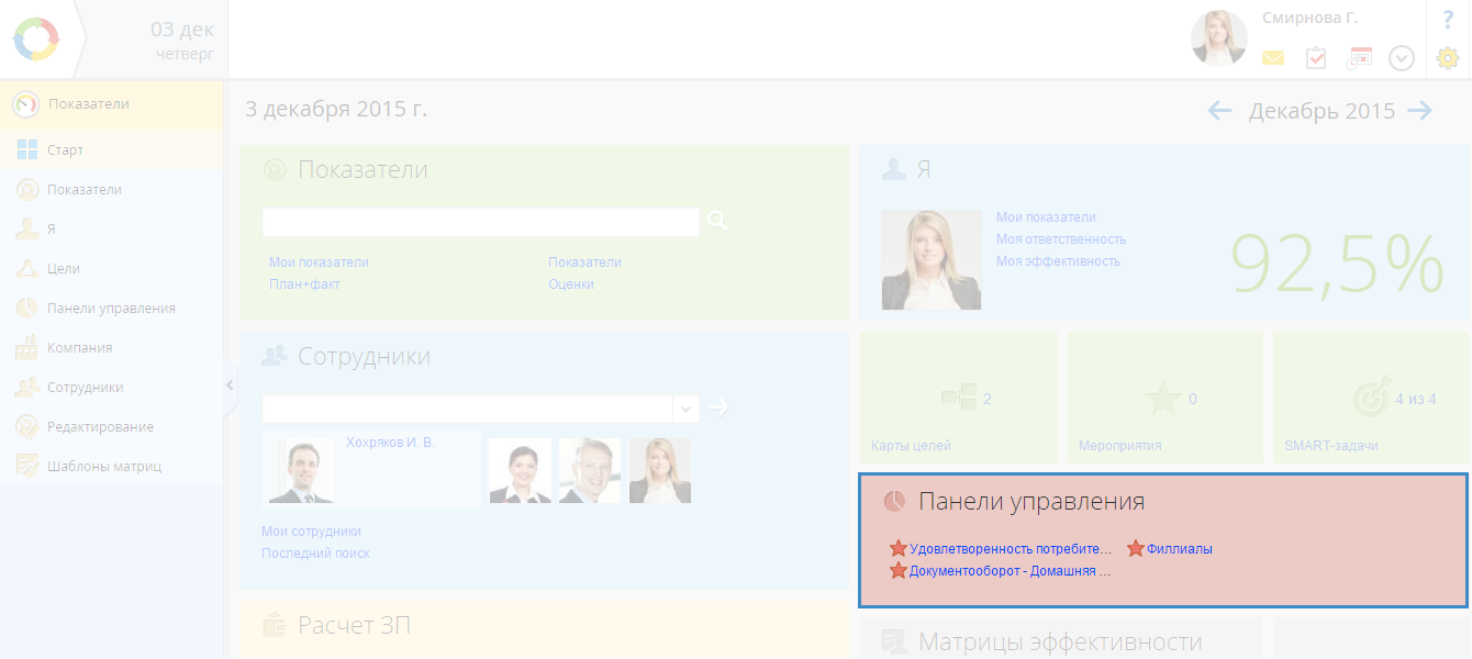 Права на раздел Панели управления устанавливает Администратор системы в разделе Администрирование - Показатели - Общие настройки доступа - Доступ к разделу "Панели управления".