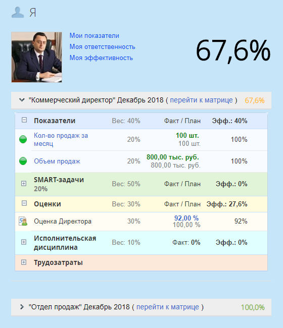 В данном портлете (рис. 1, рис. 2) совмещено несколько портлетов приложения ELMA KPI: Я и Матрица эффективности. Данные, отображаемые в портлете Я, с матрицей эффективности, аналогичны данным, отображаемым по отдельности в портлетах Я и Матрица эффективности. По умолчанию все матрицы эффективности находятся в свернутом состоянии (рис. 1).