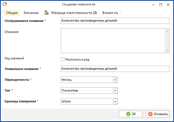 Рис. 1. Создание показателя "Количество произведенных деталей". Вкладка "Общие"