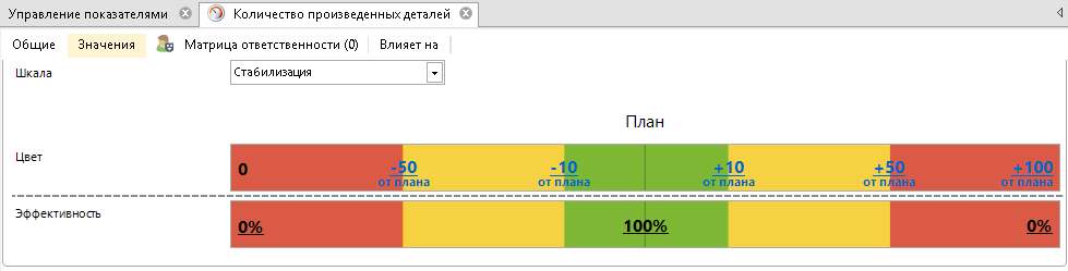 Рассмотрим пример расчета эффективности показателя при использовании шкалы Стабилизация на примере показателя Количество произведенных деталей.