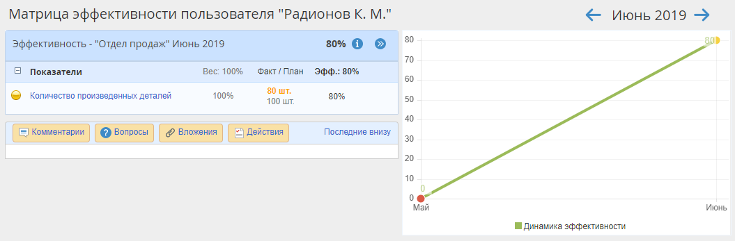 Для расчета эффективности показателя необходимо ввести плановые и фактические значения показателя в веб-приложении.