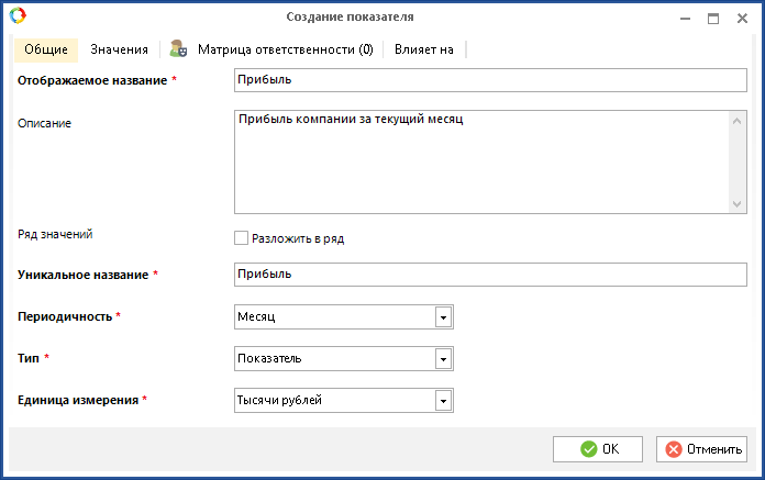 Рис. 5. Создание показателя "Прибыль". Вкладка "Общие"