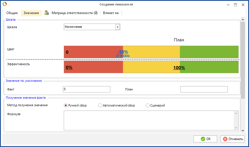 Пример настройки и расчета эффективности показателя при использовании шкалы "Увеличение"