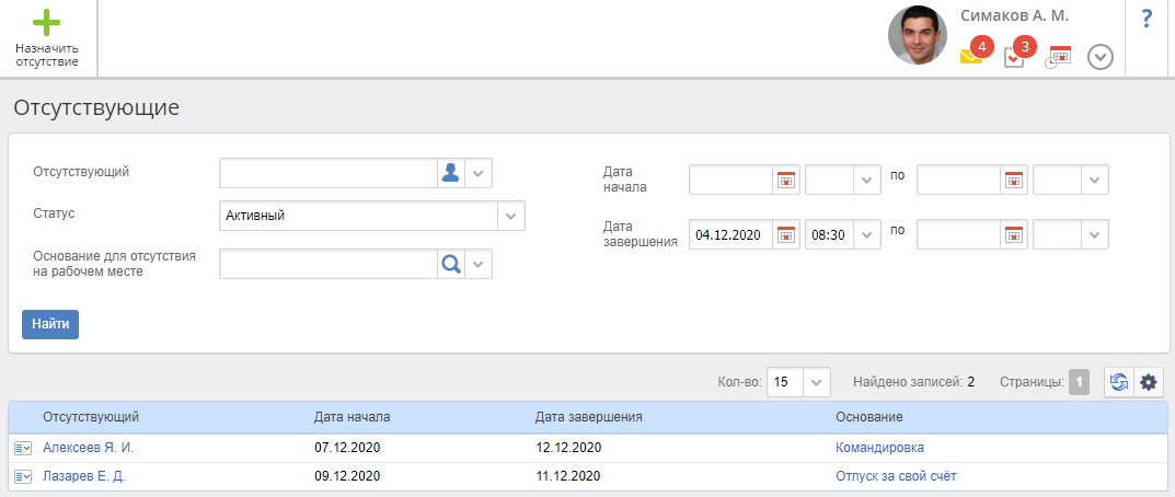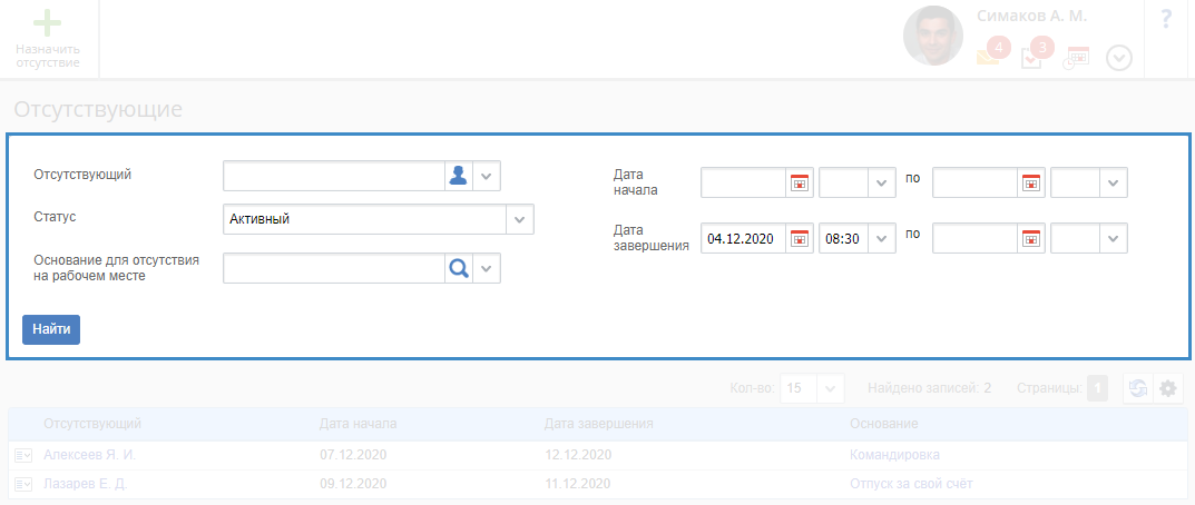 Для фильтрации отсутствий необходимо заполнить требуемые поля на форме фильтрации и нажать на кнопку Найти. В таблице данных будет сформирован новый список отсутствий в зависимости от заданных параметров.