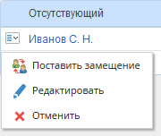Действия с отсутствиями осуществляются с помощью кнопки контекстного меню, расположенной в таблице данных слева от столбца Отсутствующий.