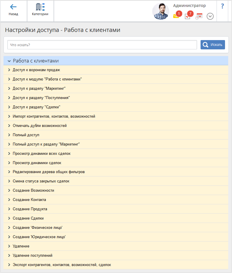 Права доступа к объектам модуля Работа с клиентами назначаются в разделе Администрирование – Пользователи – Настройки доступа – Работа с клиентами.