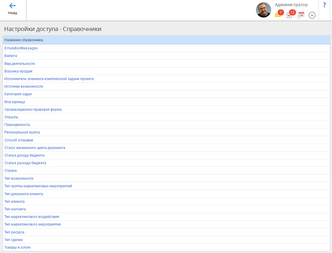 Рис. 1. Страница "Настройки доступа – Справочники"