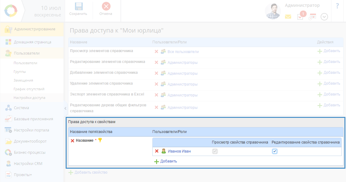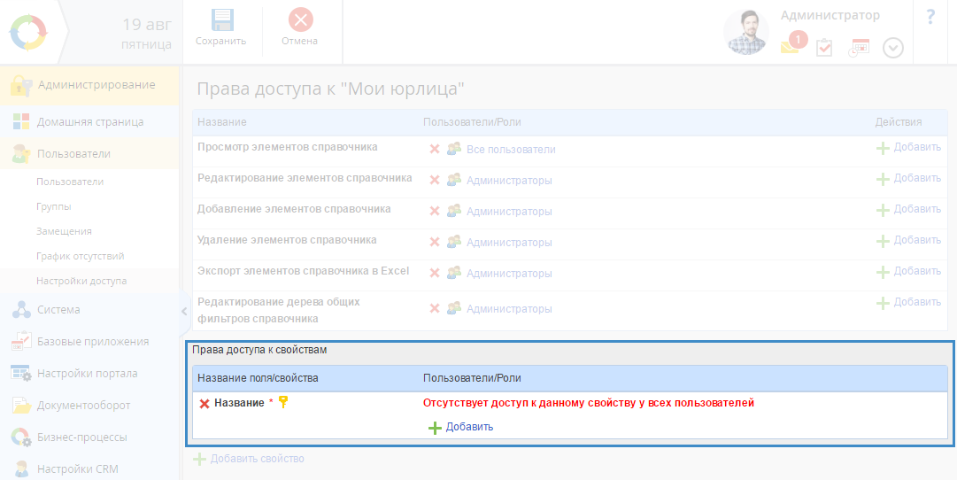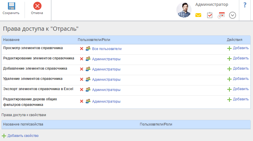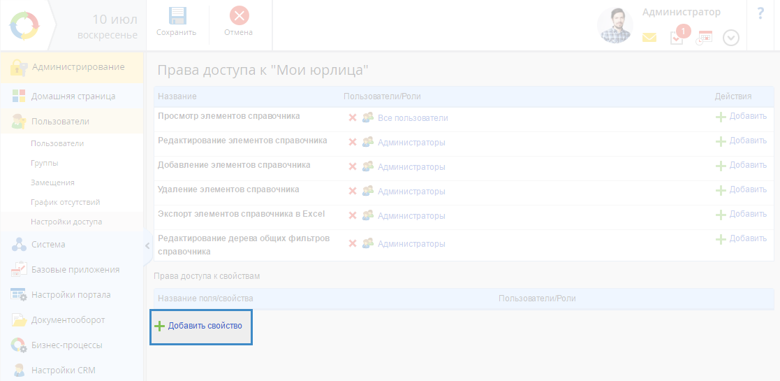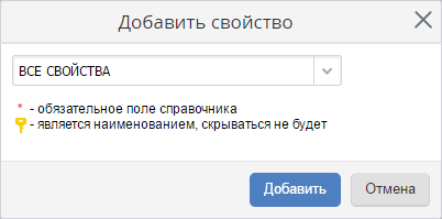 Также существует возможность настройки прав доступа к свойствам записи справочка (т.е. скрывать/отображать некоторые из данных свойств в зависимости от прав доступа пользователей). Для этого необходимо нажать на кнопку Добавить свойство (рис. 3), расположенную под настройками доступа к справочникам в блоке Права доступа к свойствам. По умолчанию пользователи имеют доступ ко всем свойствам справочников (блок Права доступа к свойствам не заполнен).
