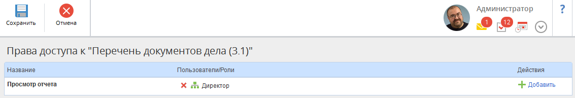 Для назначения прав доступа к одному из отчетов необходимо нажать на его название. На открывшейся странице (рис. 2) необходимо нажать на кнопку Добавить, в открывшемся диалоговом окне выбрать требуемых пользователей и нажать на кнопку Выбрать – Сохранить.