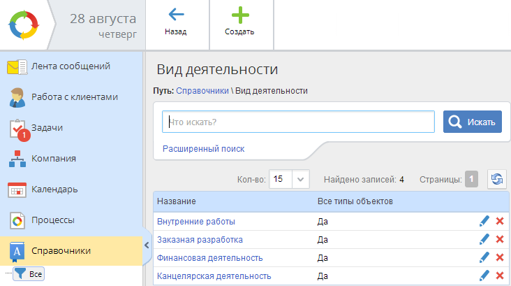 Трудозатраты можно группировать по видам деятельности. Это позволяет оценивать полезную загрузку сотрудников и группировать её по направлениям развития компании. Список видов деятельности формируется в справочнике Вид деятельности (рис. 1). Справочник можно открыть из раздела Администрирование – Базовые приложения – Задачиили группы Задачи раздела Справочники.