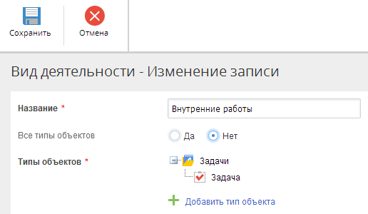Все типы объектов - переключатель, определяющий, будет ли выбранный вид деятельности доступен для всех типов объектов, или только для ограниченного перечня, указанного в блоке Типы объектов.